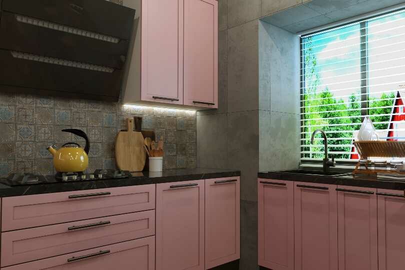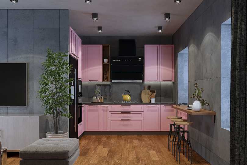 Compact L shaped kitchen light pink matt finish