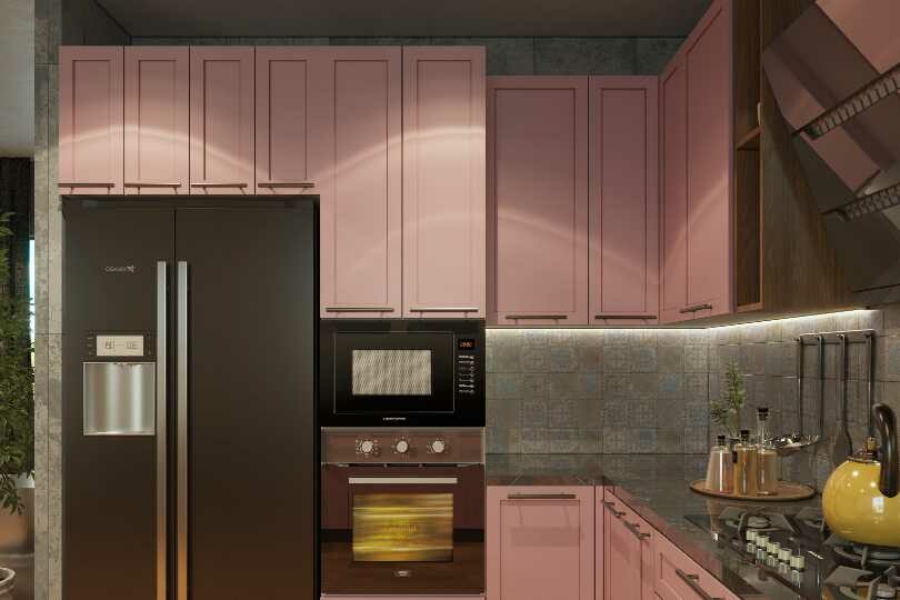 The charming baby pink PU painted shutters on an L-shaped layout creates a cosy feeling. The warm and inviting wooden floors adds sophistication to the design. The oven and microwave are seamlessly integrated into the structure besides the refrigerator creating a sleek and streamlined appearance.